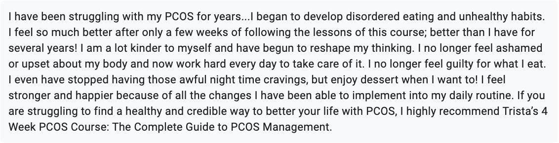 improvement in hormone-related symptoms, such as more consistent cycles, fewer mood swings, less acne, and significantly less day-to-day frustration with PCOS.